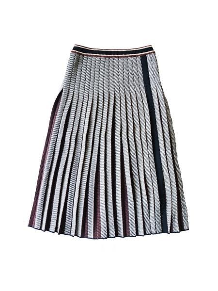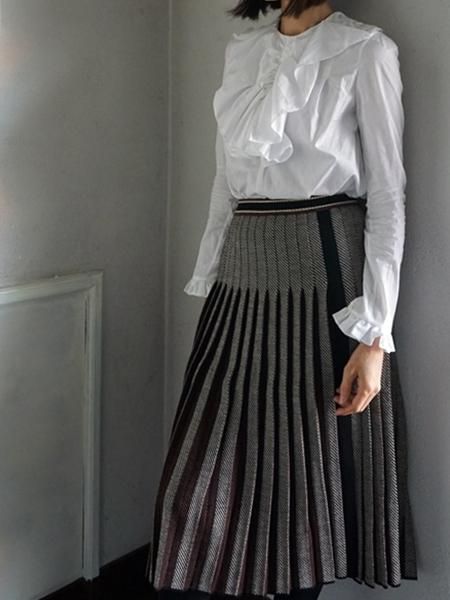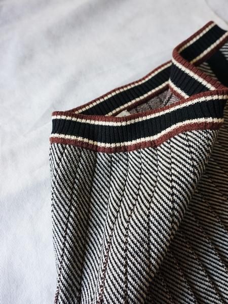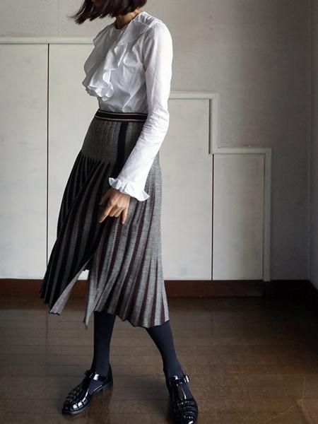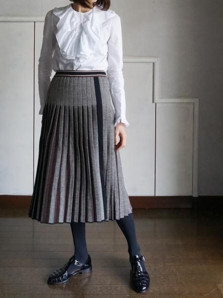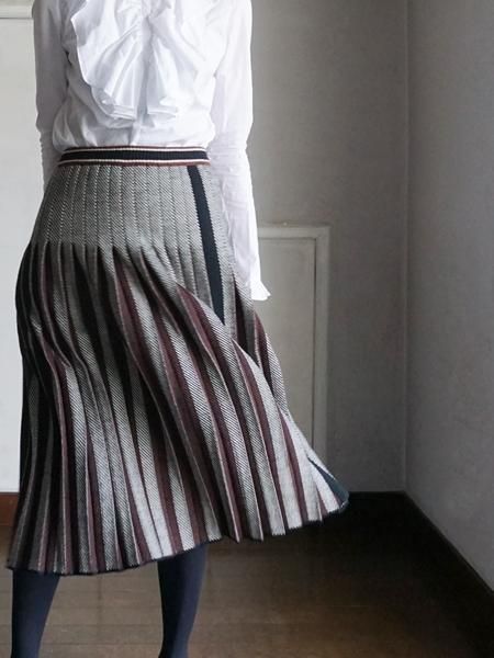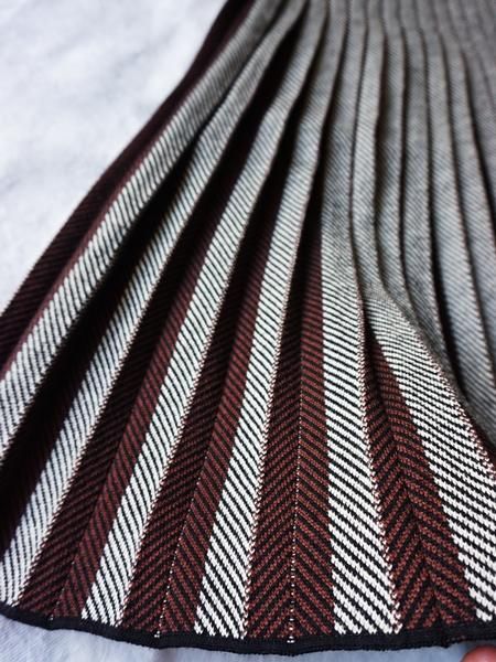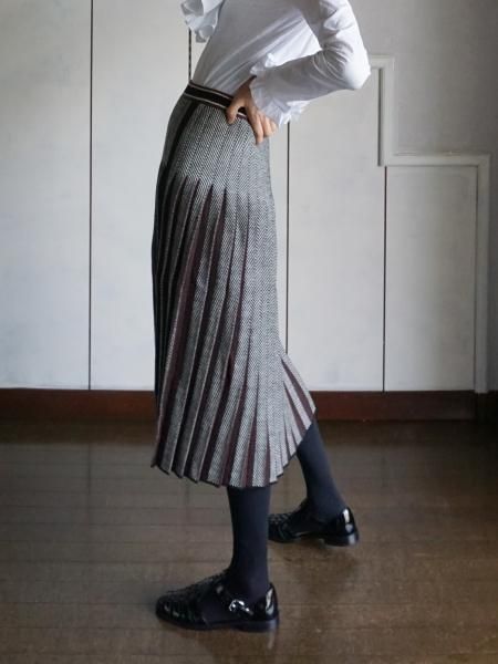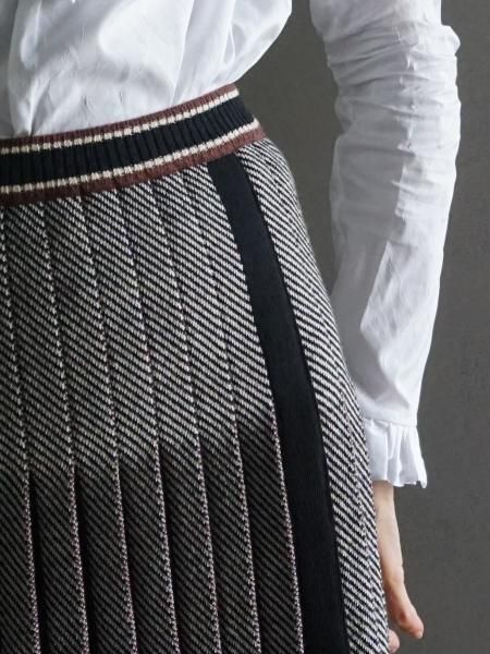 ブラックホワイトのへリンボーンの編地のニットスカートは、プリーツの間にブラウンを挟んであります。