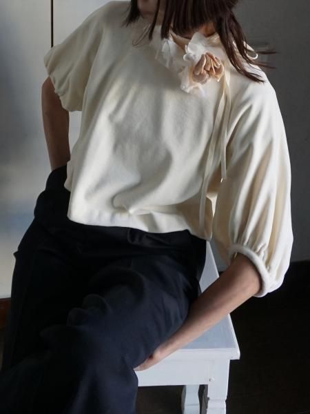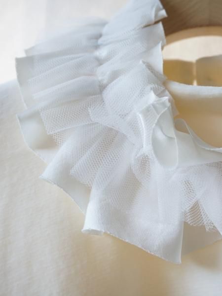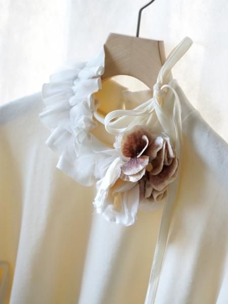 スタンドカラーのトップに手染めのコサージとチュール&フリルの衿飾り。