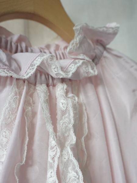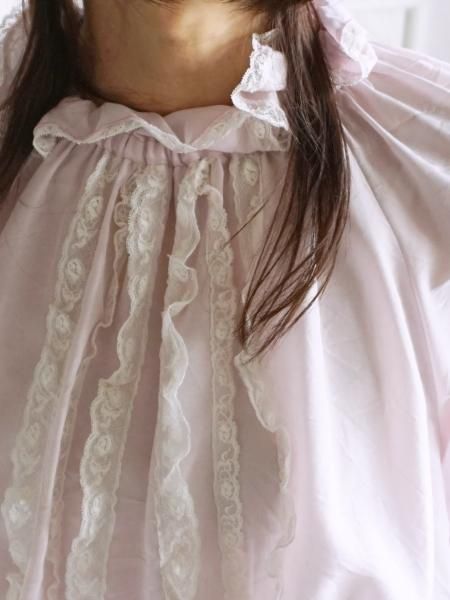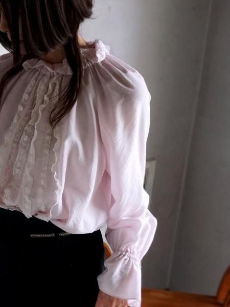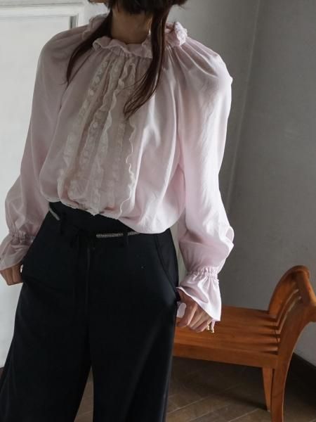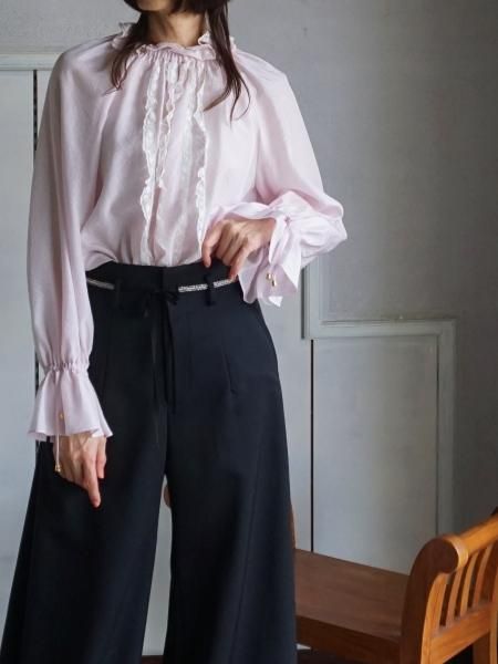 襟元やフロントに繊細なレースを施し、立体感のある印象的なデザインのブラウスです。