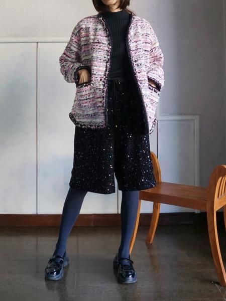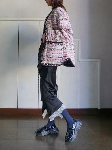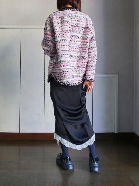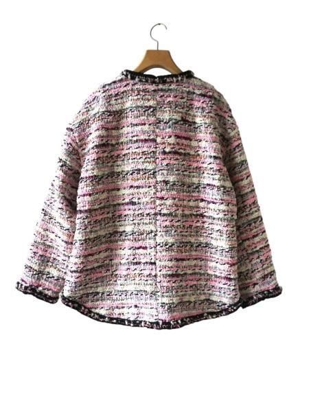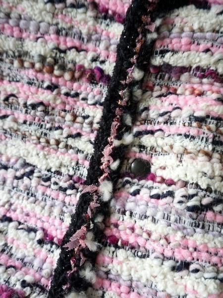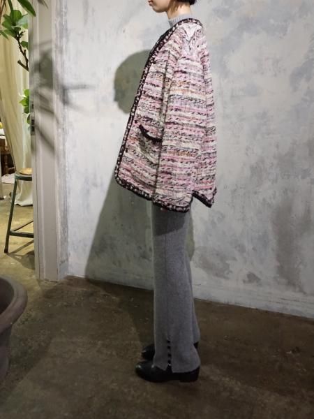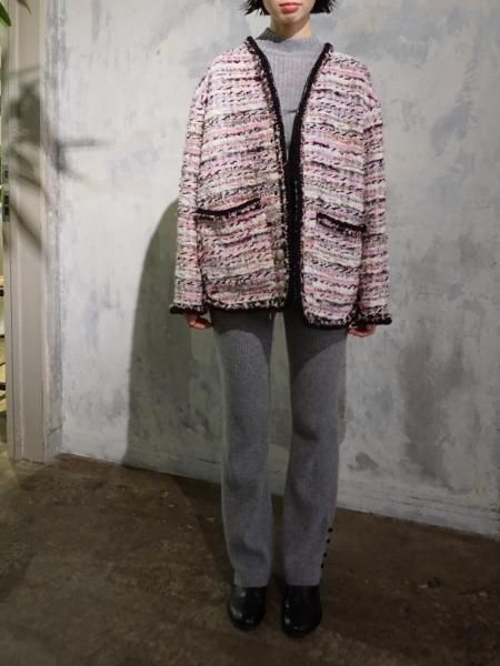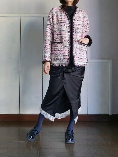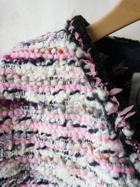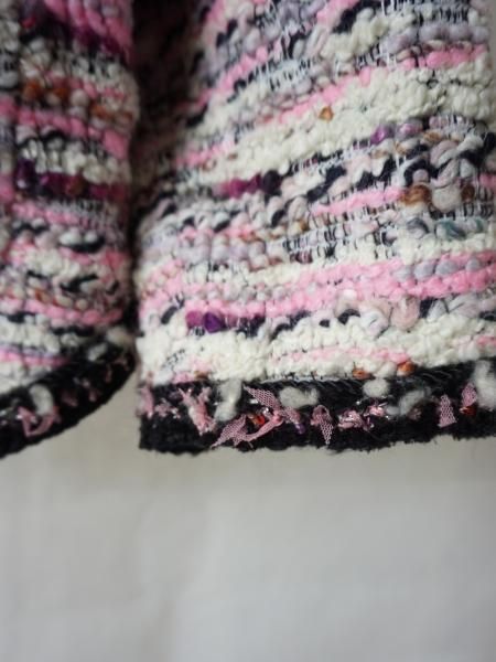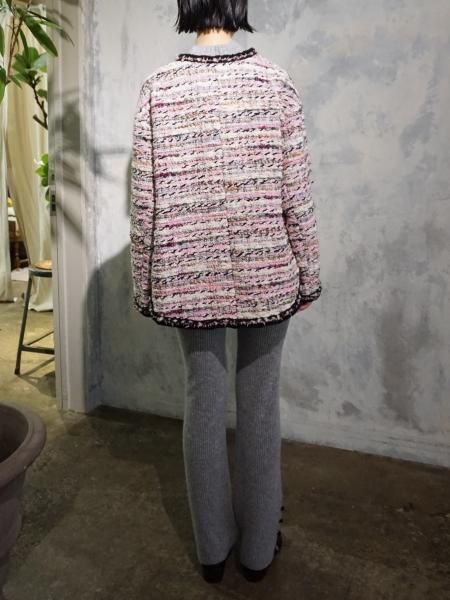 フランスのMALHIA KENT 社のツィードを使用したジャケットです。襟ぐりから前立て袖口ポケット口のトリミングは、すべて手編みのブレード(縁飾り)が施されています。時間と手間を惜しまず細部にまでこだわったジャケットです。