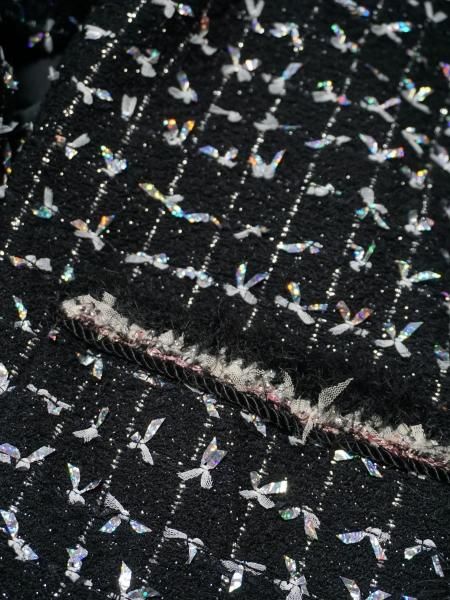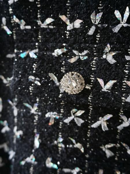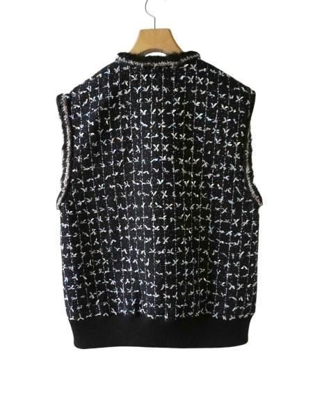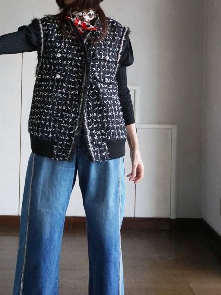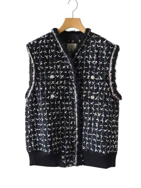 フランスのMALHIA KENT 社のツィードを使用したベストです。襟ぐりから前立て袖口ポケット口のトリミングは、すべて手編みのブレード(縁飾り)が施されています。時間と手間を惜しまず細部にまでこだわったベストです。