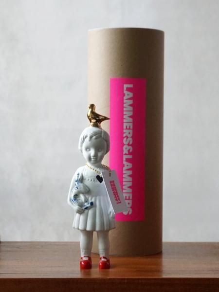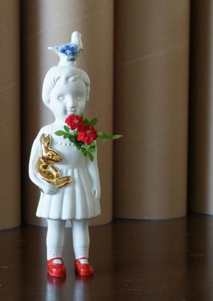 きらめく金色のディテール、デルフトブルーの彩色と赤い靴の特徴のポーセラインドールがシグネチャーです。